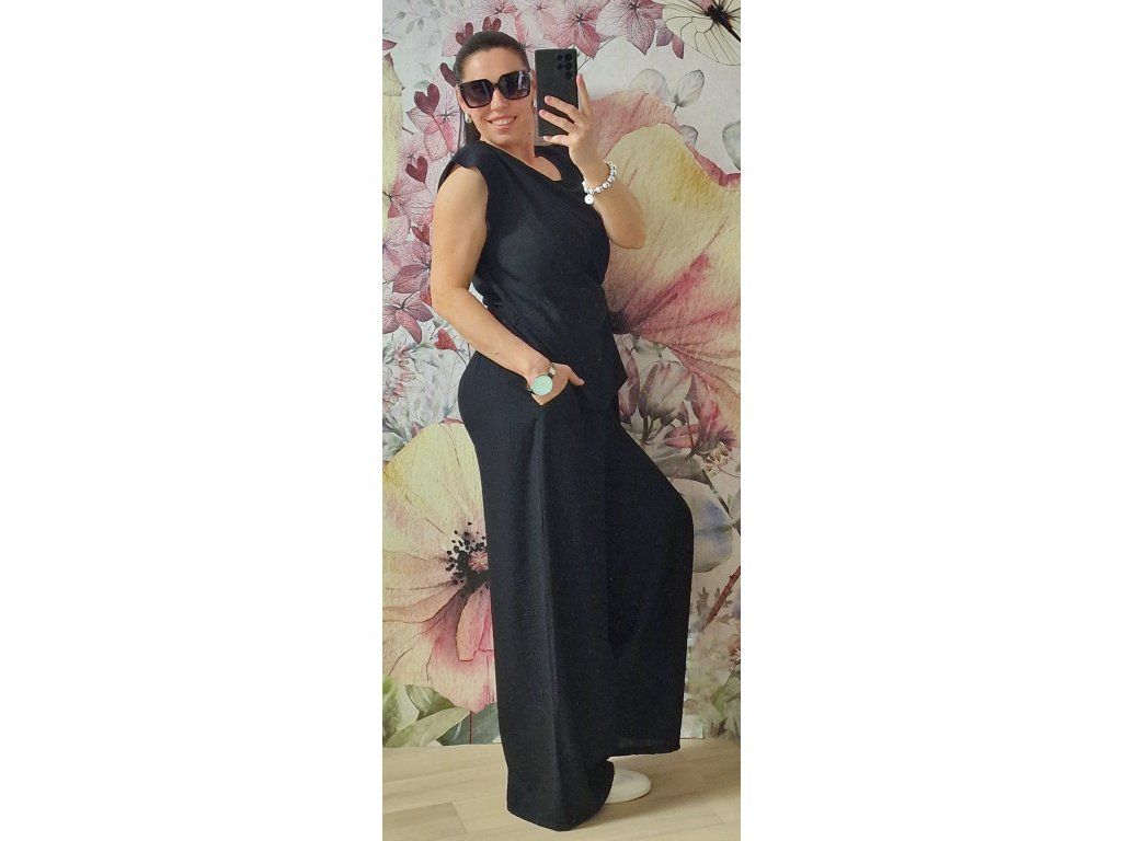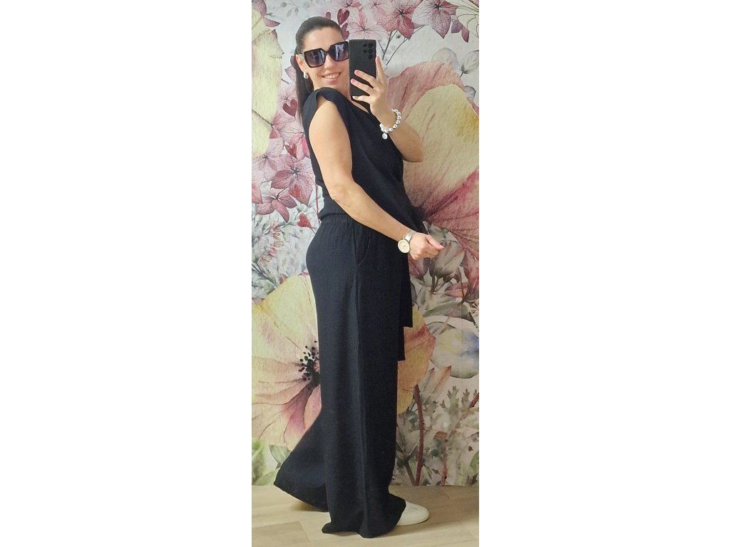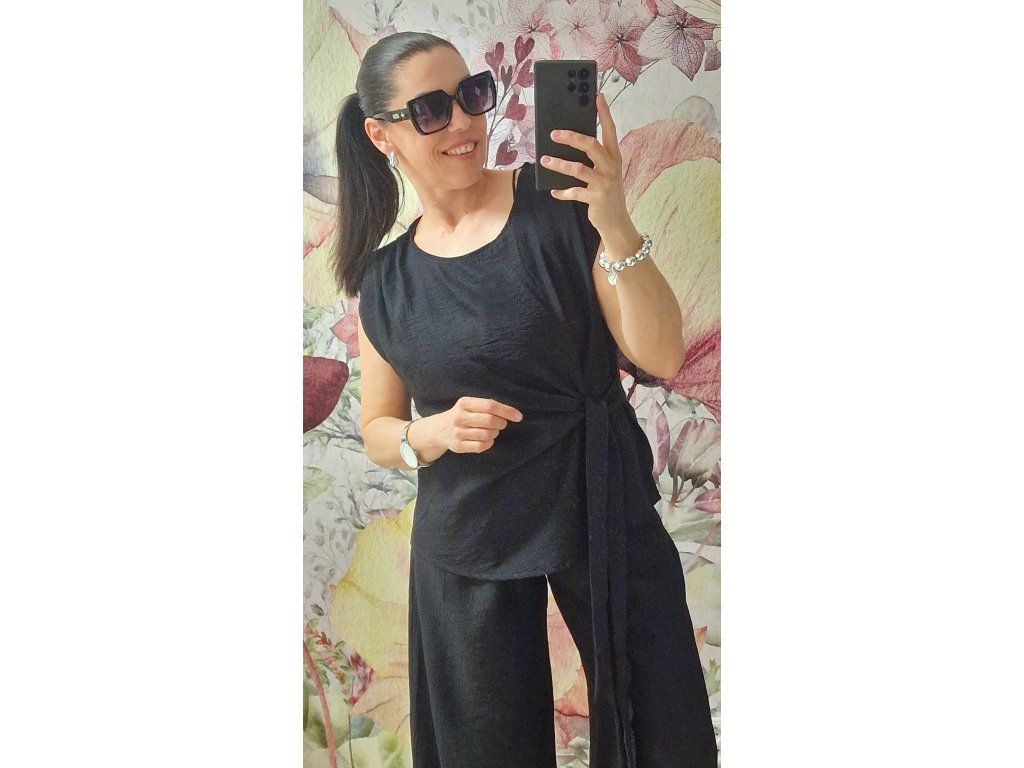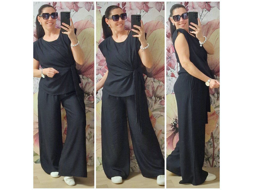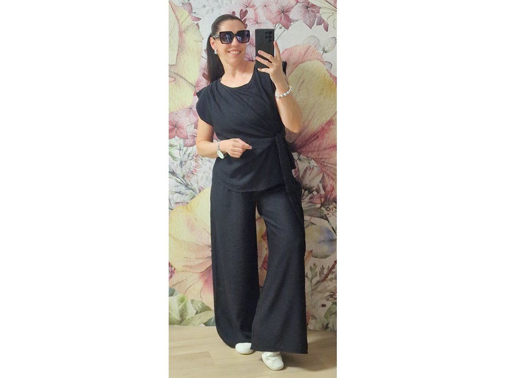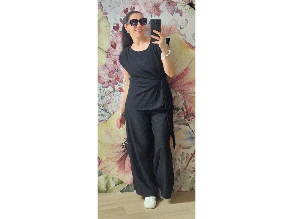 Šmrcovní lehounký krásný set 🖤 velice pohodlný a příjemný!! Široké kalhoty v pase na gumu, kapsy. Tunika s jednoduchým zavazáním krásně schová co potřebujeme 🤗Velikost ONE odpovídá XS-S-M-L-XL, záleží jak kdo rád nosí... 😊